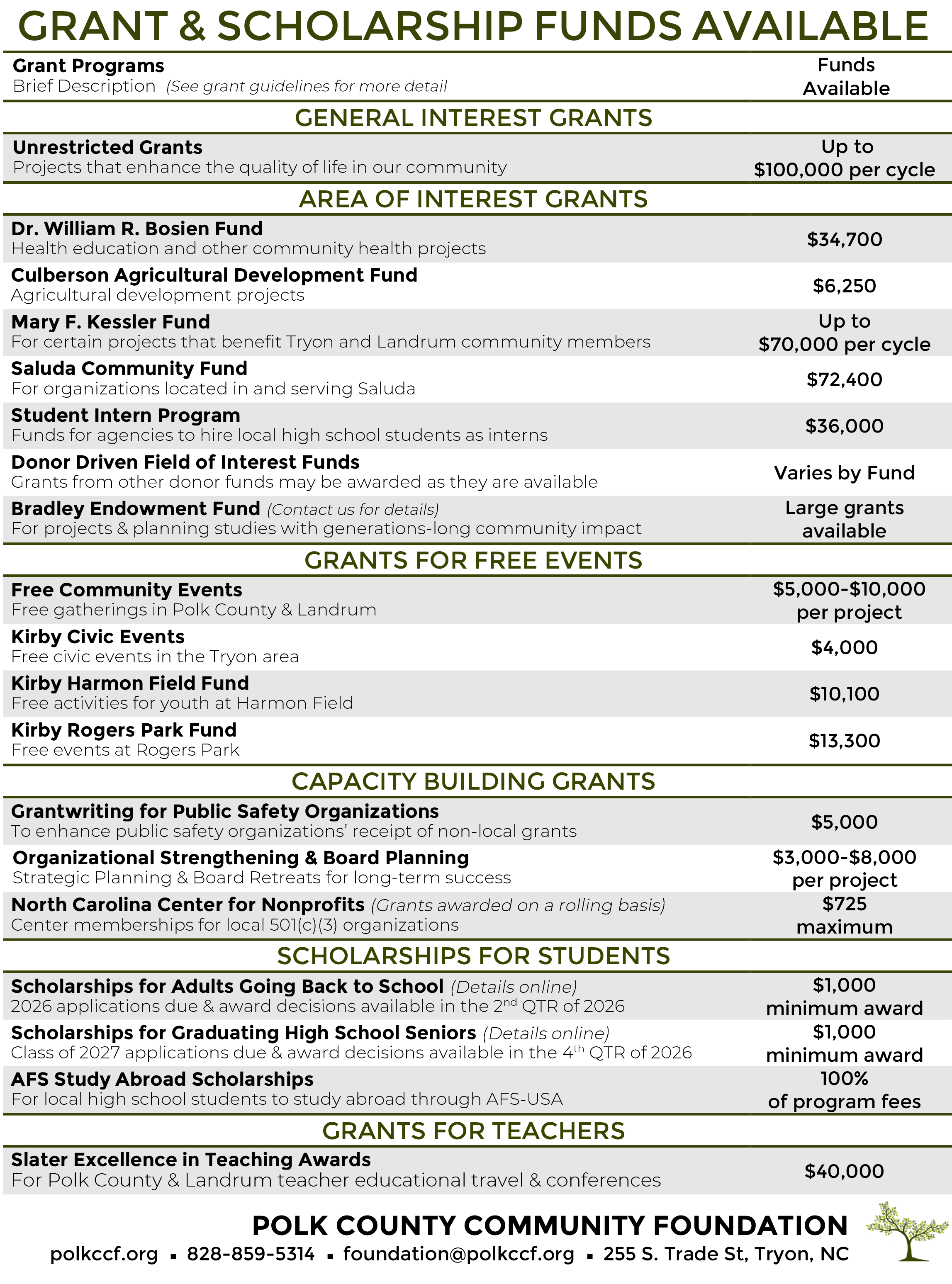 Our "Dates & Dollars" sheet below provides a quick snapshot of currently available funds. To open the file for printing or saving to your computer, click here.